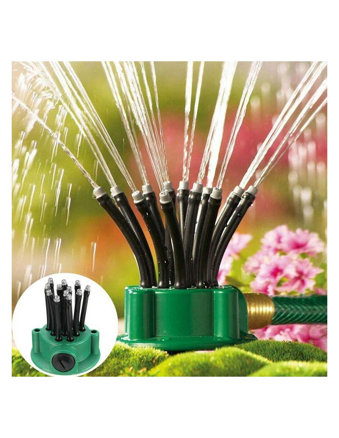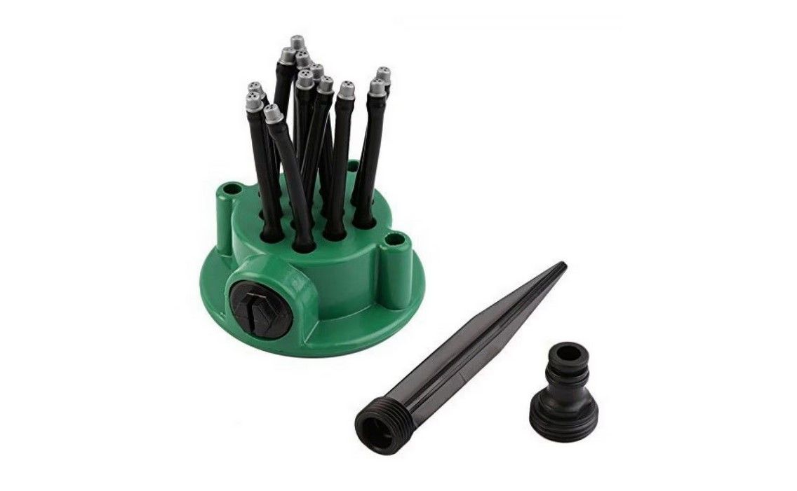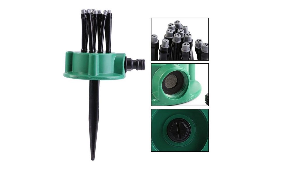 Aspensor gradina 360 grade, prevazut cu 12 furtuniri flexibile. Fiecare furtun are 3 orificii, acestea pot dispersa apa pana la 360 grade.
