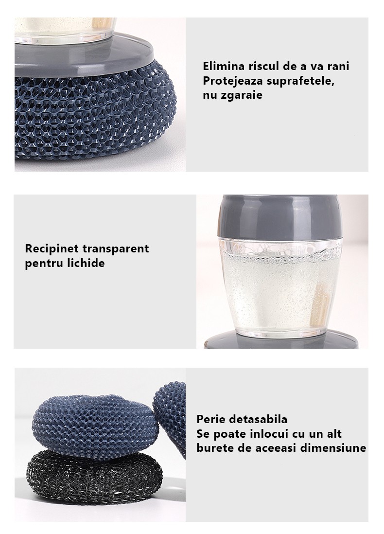 - dispenser pentru detergentul de vase, distribuie lichidul automat in momentul in care apasati botonul din partea superioara a dispozitivului.